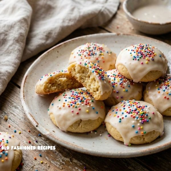 These cookies are soft and cake-like rather than crisp, with a rich buttery base, gentle vanilla aroma, and a fluffy interior thanks to plenty of baking powder and eggs. Once they cool, they’re dipped into a silky vanilla icing and crowned with sprinkles — classic rainbow nonpareils or jimmies that make them look like tiny festive clouds.